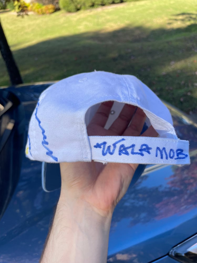 Hand drawn with fabric marker. Standard size, adjustable back.