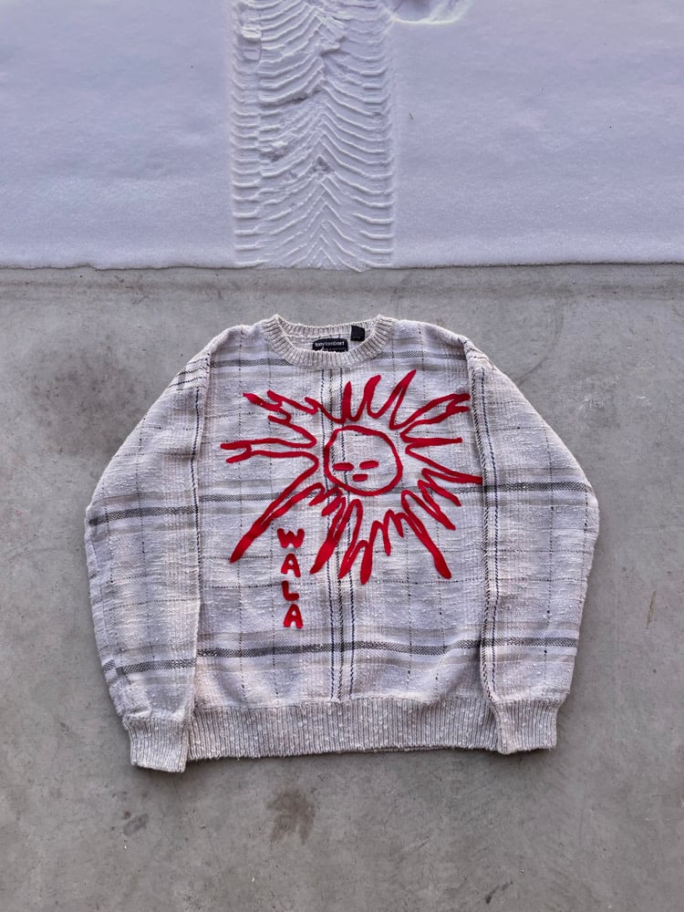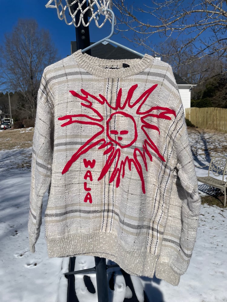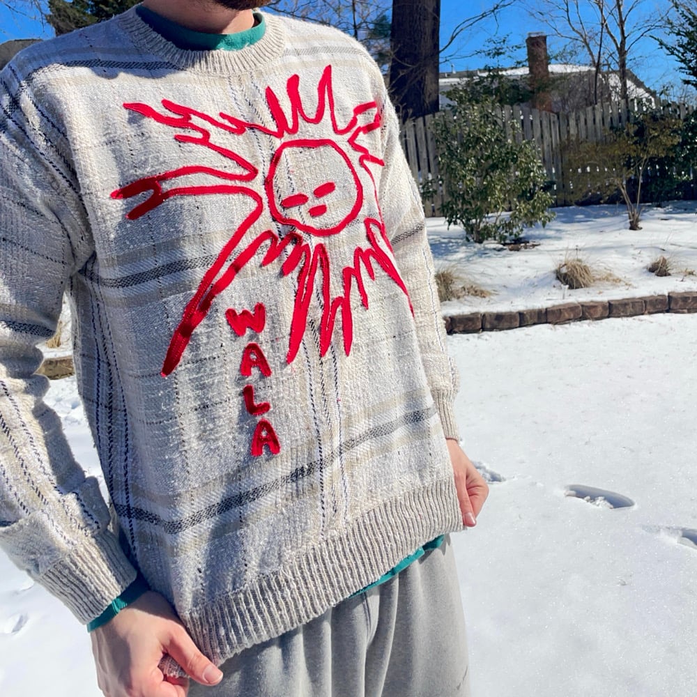 Size Large (fits snug). Knit sweater with hand-cut appliqué design.