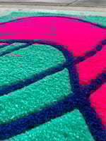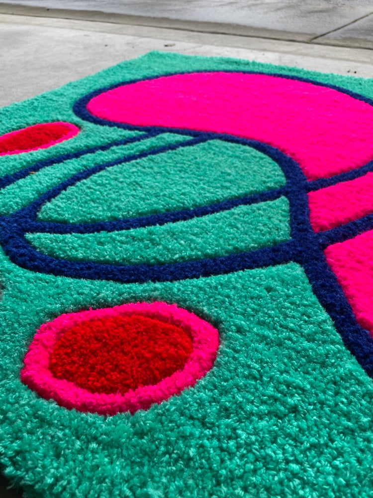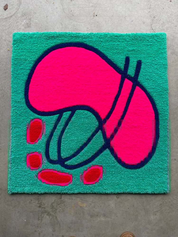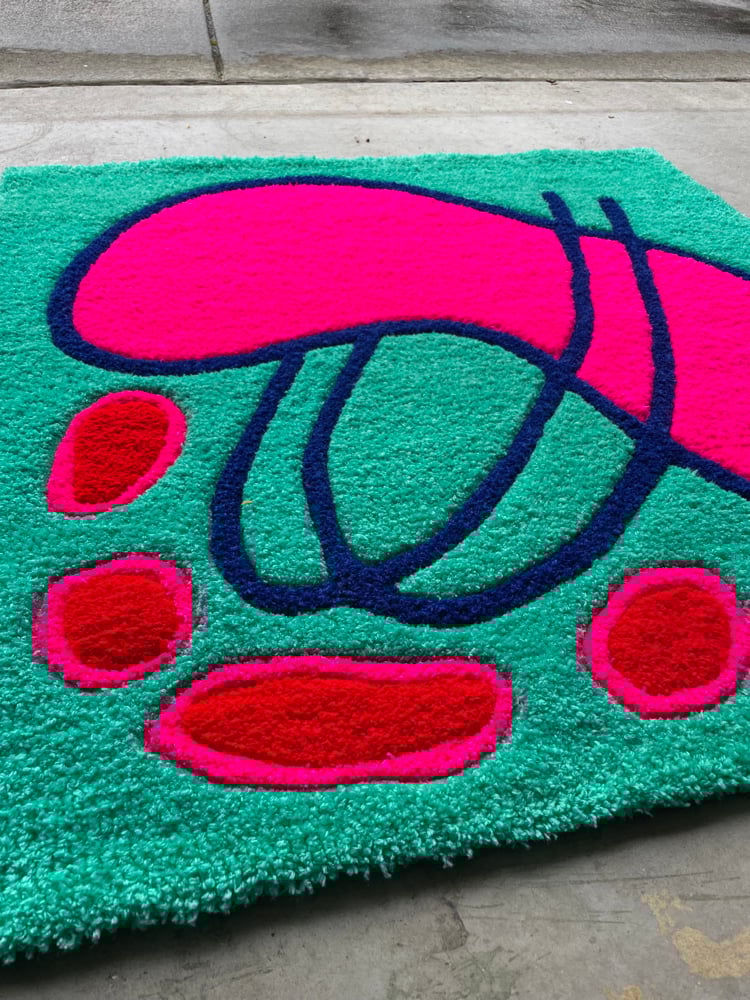 42”x42” cut-pile tufted rug. Trimmed and contoured by hand. Acrylic yarn. Non-slip backing.