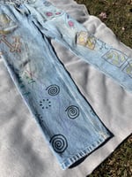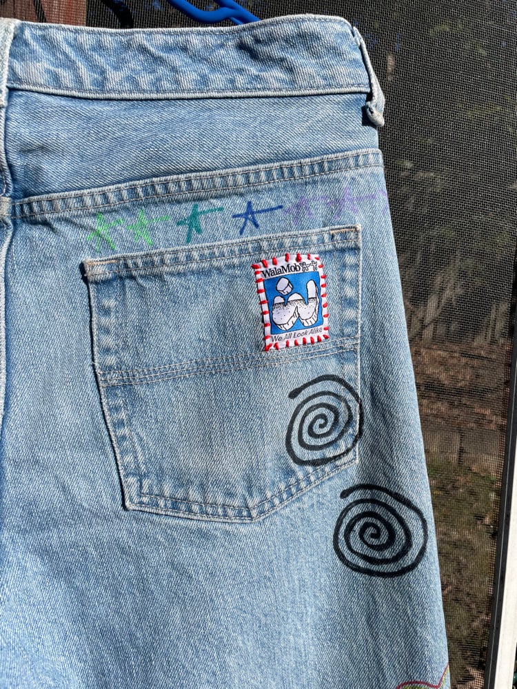 Hand drawn with fabric marker. Vintage Van Heusen jeans. 34” waist, 32” inseam.