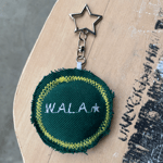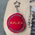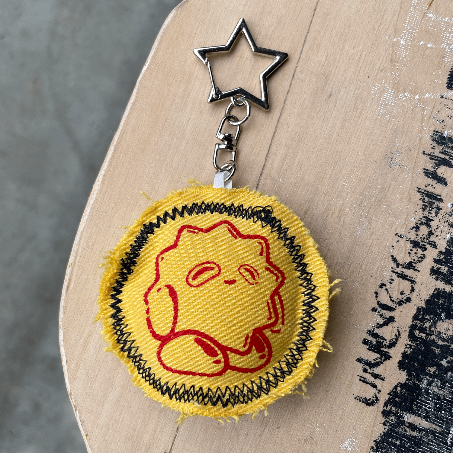 6 possible colors! Keychains are screenprinted on scrap denim and machine embroidered/stitched. Features star shaped clasp. Roughly 2" in diameter.
