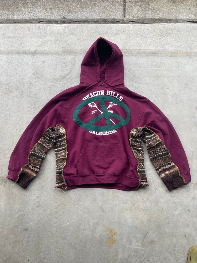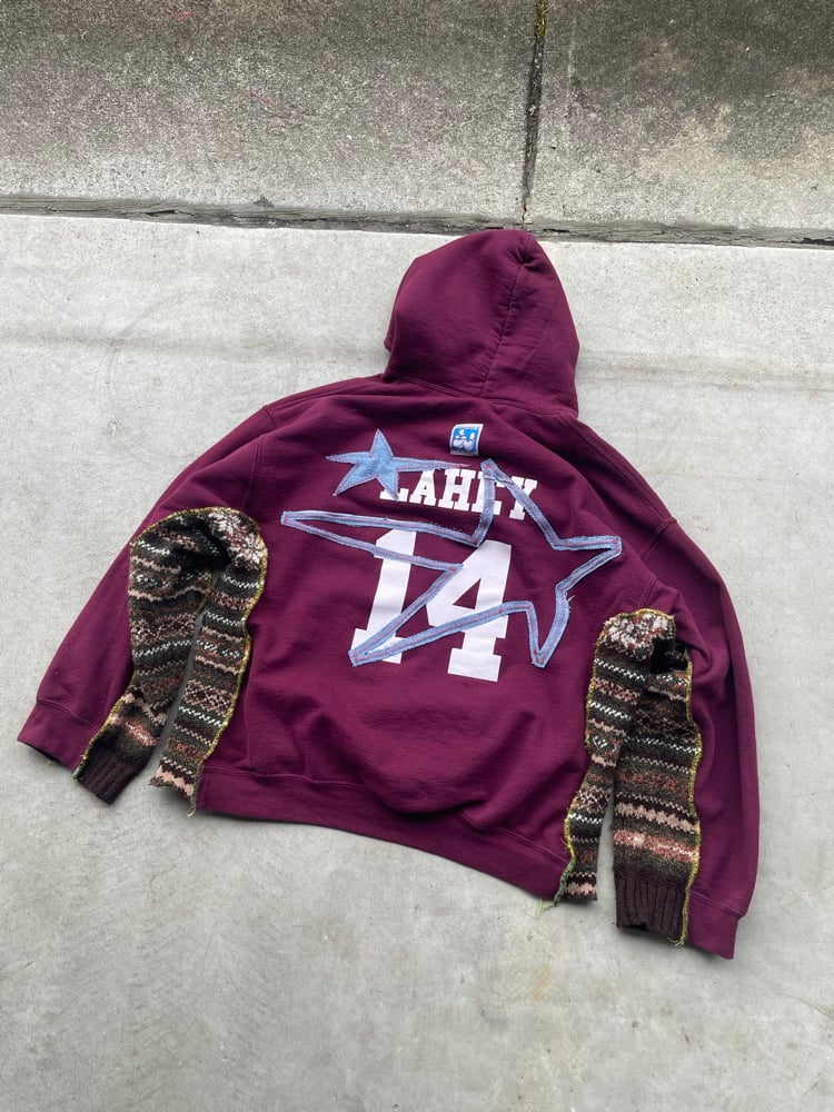 Size Large/XL. A combination of hoodie and knit sweater, with denim appliqué design on front and back.