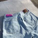 Size 33" waist, 31" inseam, 42" outseam, 12" rise, women's cut. Levi's 501 light-wash denim. Galaxy screen prints on both pant legs. Walamob dolphin tag on back waistband.