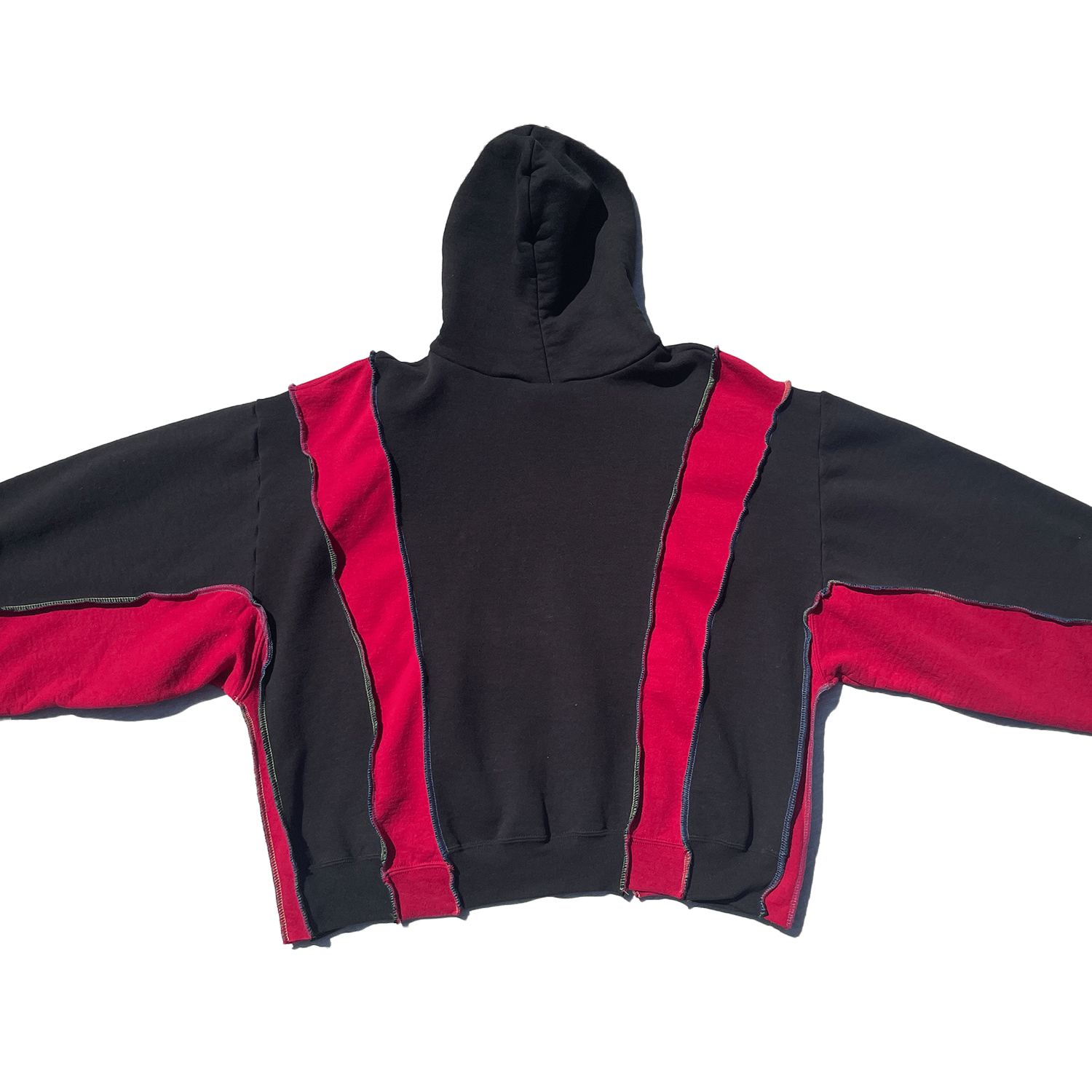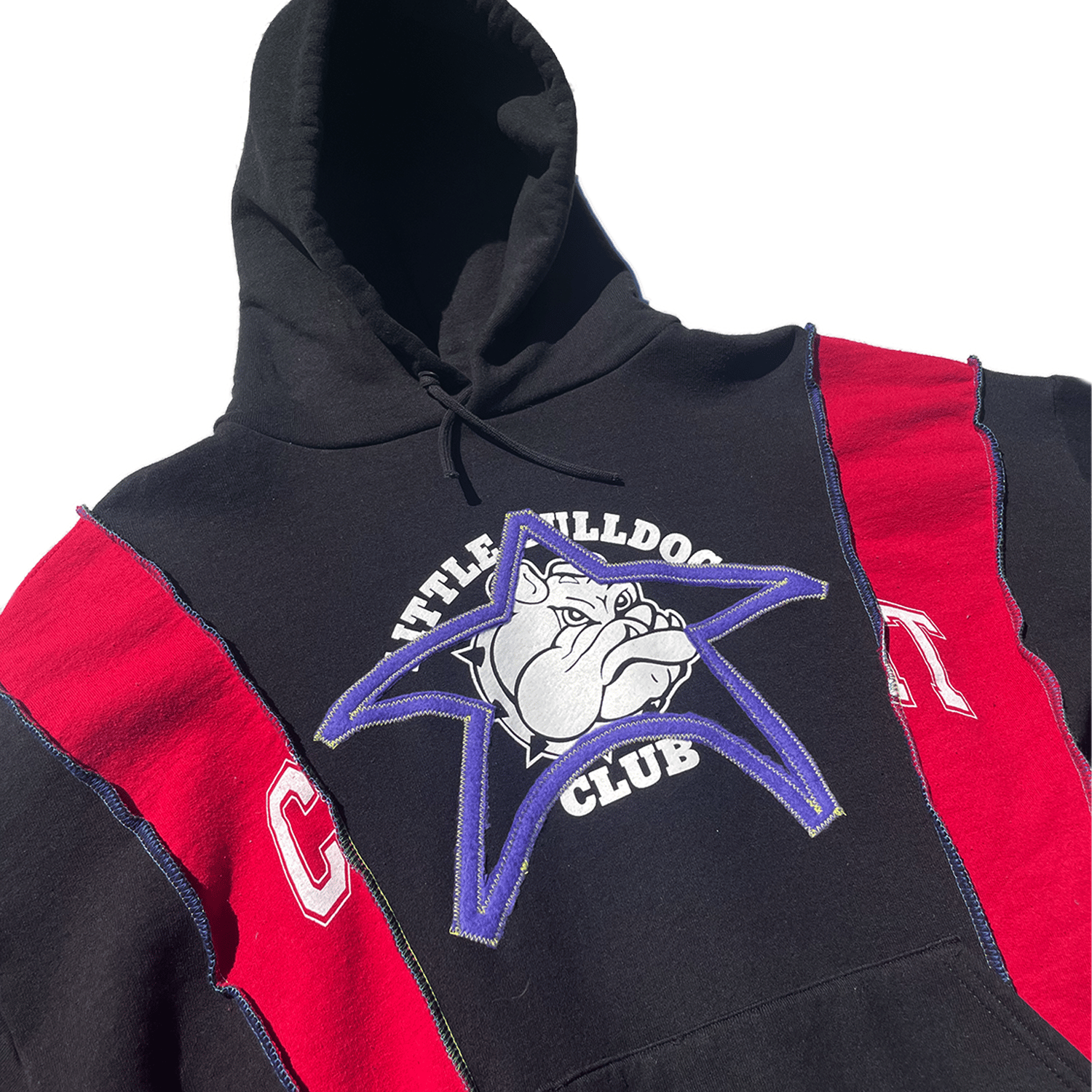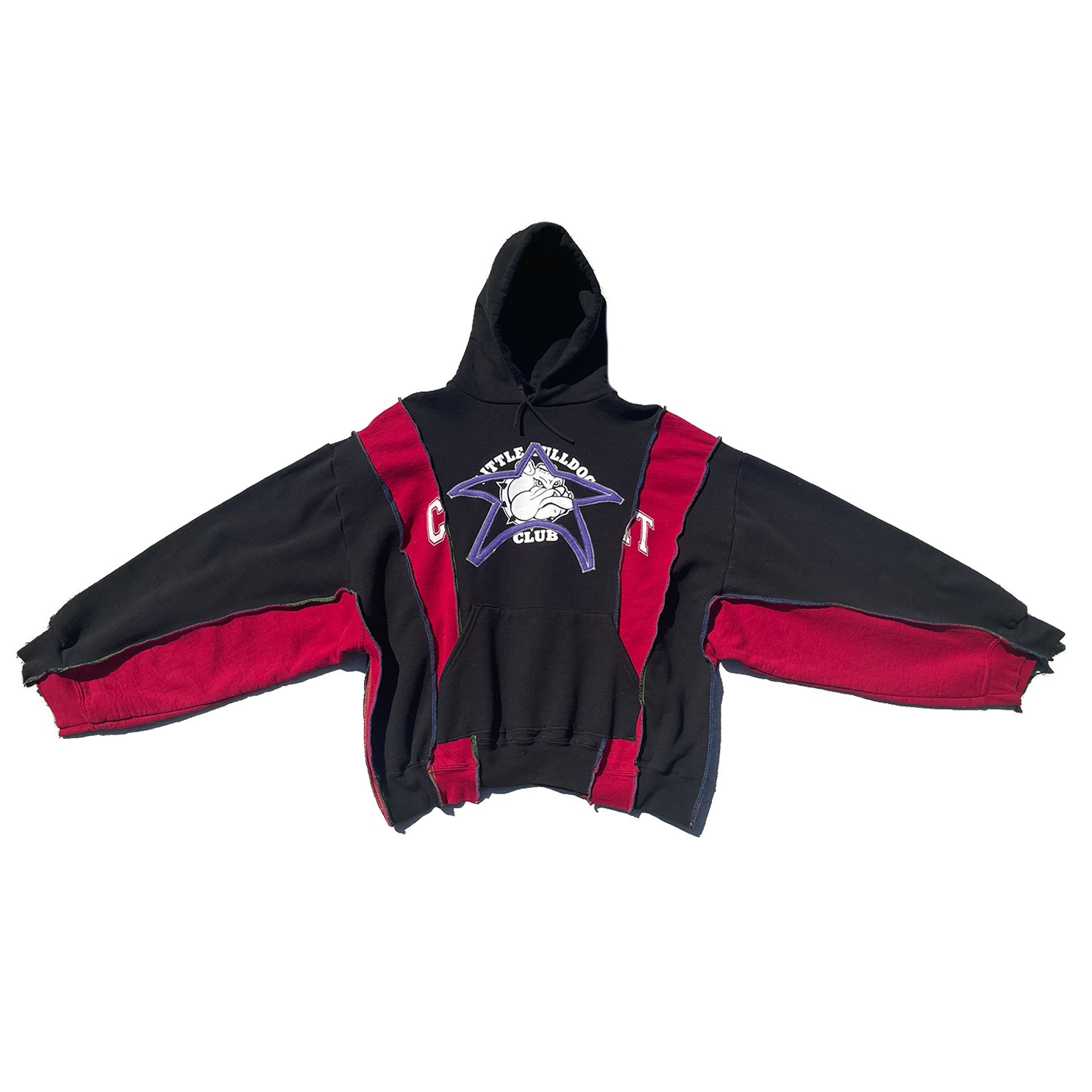 Size XL. Frankenstein-assembly hoodie made from combining two sweatshirts. Features a felt star appliqué on front.